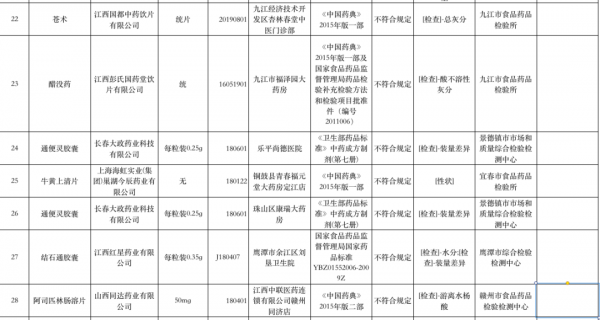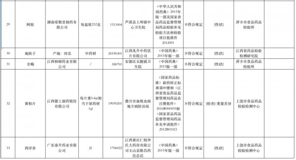 經(jīng)核查確認(rèn),本期監(jiān)督抽檢信息公布如下:30個品種33批次不符合標(biāo)準(zhǔn)規(guī)定,不符合規(guī)定項目包括性狀、檢查、含量測定等。