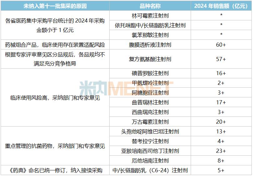 7月15日發(fā)布的《關(guān)于開(kāi)展第十一批國(guó)家組織藥品集中采購(gòu)相關(guān)藥品信息填報(bào)工作的通知》中有一份“過(guò)評(píng)數(shù)量達(dá)到條件未納入第十一批集采的藥品”名單,其中注射劑占了16個(gè)。腹膜透析液注射劑、復(fù)方氨基酸注射劑、碘普羅胺注射劑、曲普瑞林注射劑、萬(wàn)古霉素注射劑、頭孢他啶阿維巴坦注射劑、亞胺培南西司他丁注射劑7個(gè)超10億重磅品種暫時(shí)躲過(guò)一劫。