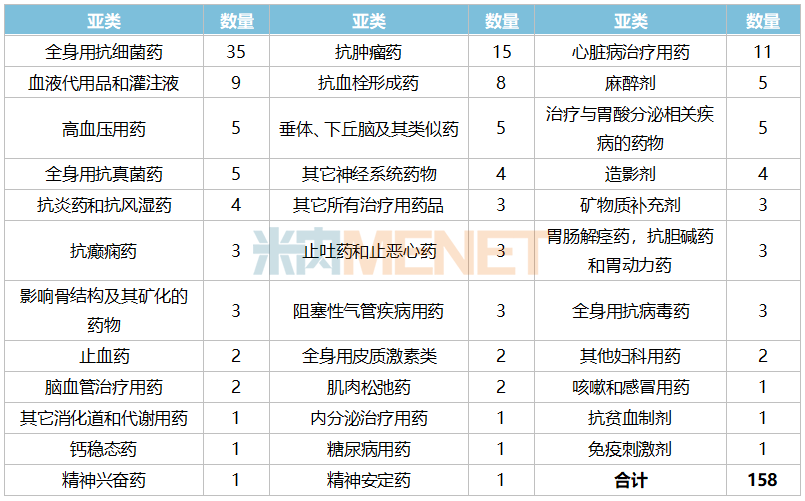 從亞類來(lái)看,血液代用品和灌注液占了4個(gè),阻塞性氣管疾病用藥、心臟病治療用藥、全身用抗細(xì)菌藥、肌肉松弛藥各占了2個(gè),治療與胃酸分泌相關(guān)疾病的藥物、止吐藥和止惡心藥、造影劑、胃腸解痙藥及抗膽堿藥和胃動(dòng)力藥、全身用皮質(zhì)激素類、其它消化道和代謝用藥、麻醉劑、抗腫瘤藥、抗炎藥和抗風(fēng)濕藥、抗分枝桿菌藥、咳嗽和感冒用藥11個(gè)亞類各占1個(gè)。