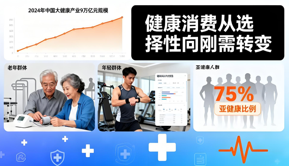 隨著生活水平的提高,人們健康意識不斷增強,健康消費需求正從“選擇性消費”向“健康剛需”轉(zhuǎn)變。中國消費者協(xié)會發(fā)布的報告顯示,2024年中國大健康產(chǎn)業(yè)總收入規(guī)模達(dá)到9萬億元,且仍在持續(xù)增長。在老齡化加劇的背景下,老年群體對健康管理、康復(fù)護(hù)理等需求大增;同時,年輕一代也更加注重生活品質(zhì)與健康預(yù)防,對個性化的健康服務(wù)如健康風(fēng)險評估、科學(xué)運動指導(dǎo)等興趣濃厚。此外,亞健康人群規(guī)模龐大,據(jù)世界衛(wèi)生組織調(diào)查,全球約75%的人處于亞健康狀態(tài),這一群體對改善健康狀況的需求急切,為新賽道的健康管理服務(wù)提供了廣闊的市場空間。
