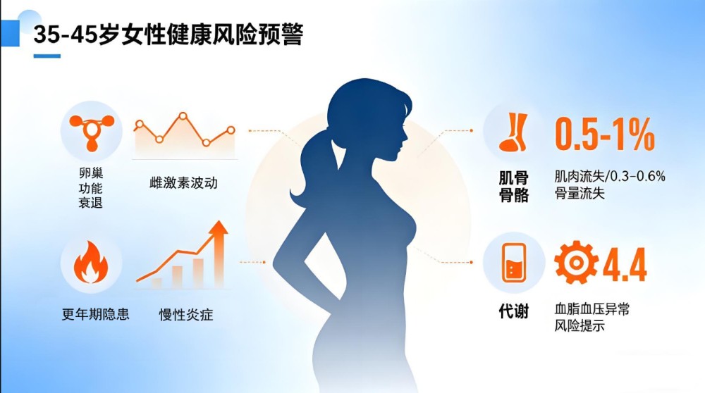 數(shù)據(jù)清晰揭示了這一階段的健康風(fēng)險(xiǎn):35~45歲女性生理已進(jìn)入“下滑預(yù)警期”,肌骨、雌激素、炎癥、心態(tài)四大維度成為核心風(fēng)險(xiǎn)。女性在35歲以后,卵巢功能以每年3%的速度衰退,雌激素從穩(wěn)定狀態(tài)轉(zhuǎn)入“波動(dòng)預(yù)警期”,為日后更年期潮熱、失眠等激素紊亂癥狀埋下伏筆;肌肉量每年以0.5%~1%、骨量以0.3%~0.6%的速度緩慢流失,不僅影響體態(tài)輕盈度,更會(huì)增加老年骨質(zhì)疏松、骨折的風(fēng)險(xiǎn);基礎(chǔ)代謝率與心血管系統(tǒng)開(kāi)始輕度退化,血脂、血壓異常的風(fēng)險(xiǎn)逐步上升;更值得警惕的是,超敏C反應(yīng)蛋白等慢性炎癥指標(biāo)隨年齡持續(xù)升高,這種“隱形火苗”會(huì)像溫水煮青蛙般加速細(xì)胞損傷,與皮膚松弛、精力下降甚至心血管疾病密切相關(guān)。