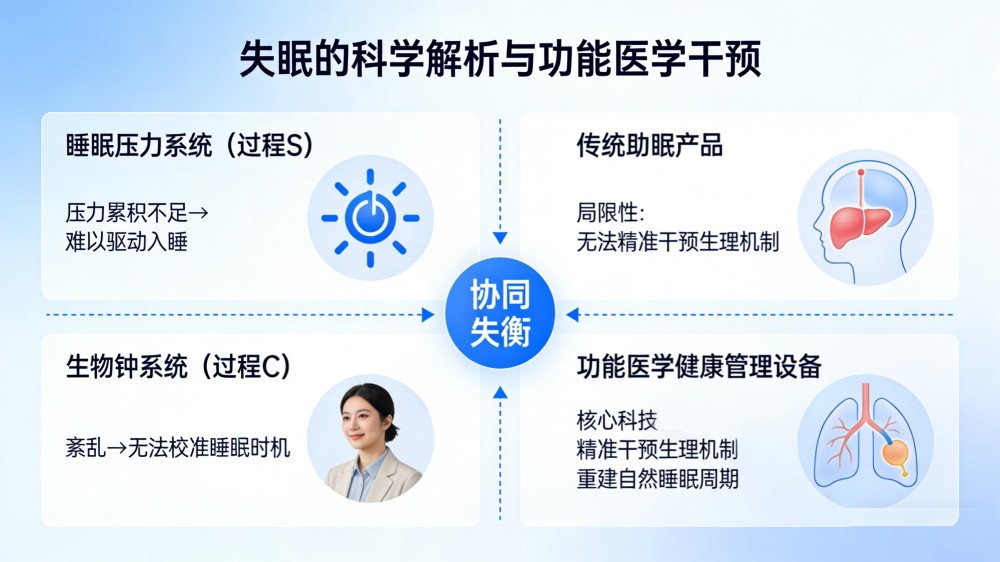 從睡眠科學(xué)視角來(lái)看,失眠的本質(zhì)是“睡眠壓力系統(tǒng)(過(guò)程S)”與“生物鐘系統(tǒng)(過(guò)程C)”的協(xié)同失衡——要么是睡眠壓力累積不足,難以驅(qū)動(dòng)入睡;要么是生物鐘紊亂,無(wú)法精準(zhǔn)校準(zhǔn)睡眠時(shí)機(jī)。傳統(tǒng)助眠產(chǎn)品的局限性,讓人們將目光投向了功能醫(yī)學(xué)領(lǐng)域的創(chuàng)新技術(shù)。臨床實(shí)踐證實(shí),搭載核心科技的功能醫(yī)學(xué)健康管理設(shè)備,能從生理機(jī)制層面精準(zhǔn)干預(yù),幫助人體重建自然睡眠周期。
