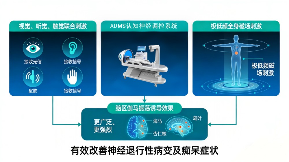 ADMS認(rèn)知神經(jīng)調(diào)控系統(tǒng),通過視覺、聽覺、觸覺多種感官聯(lián)合刺激,結(jié)合頭部腦區(qū)光生物調(diào)節(jié)、極低頻全身磁場刺激,能產(chǎn)生更廣泛、更強(qiáng)烈的腦區(qū)伽馬振蕩誘導(dǎo)效果,覆蓋海馬、島葉、杏仁核等更多癡呆癥相關(guān)腦區(qū),有效改善患者神經(jīng)退行性病變及癡呆癥狀。