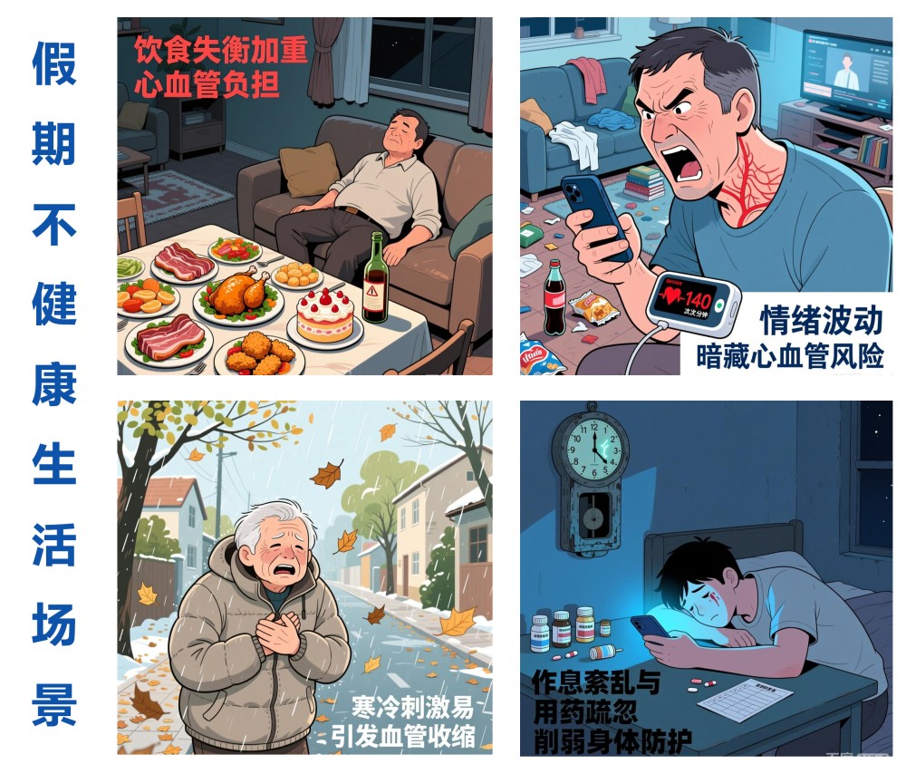 復(fù)盤假期生活,諸多細(xì)節(jié)都在悄悄透支心血管健康。其一,飲食失衡是主要誘因,高鹽、高脂、高糖食物加上飲酒過量,會(huì)加重心血管負(fù)擔(dān),誘發(fā)血管收縮、血壓波動(dòng);其二,情緒波動(dòng)暗藏風(fēng)險(xiǎn),易引發(fā)心率加快、血壓驟升,增加心血管急癥發(fā)作概率;其三,寒冷刺激雪上加霜,冬春交替之際氣溫多變,冷空氣會(huì)直接導(dǎo)致血管收縮,影響血液循環(huán),尤其對(duì)本身有心血管基礎(chǔ)疾病的人群更為不利;其四,作息紊亂與用藥疏忽,假期熬夜娛樂、作息顛倒,加上部分慢性病患者擅自停藥、漏服,進(jìn)一步削弱了身體的防護(hù)能力,讓心血管疾病有機(jī)可乘。