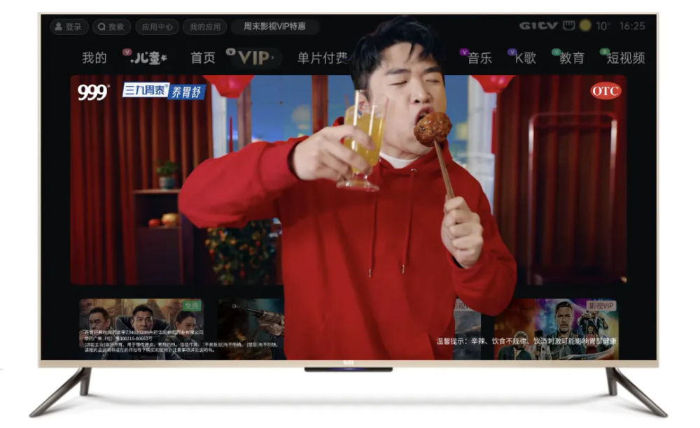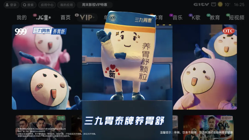 通過開機(jī)廣告強(qiáng)勢觸達(dá)、大視界廣告中心展示,OTT超大畫幅強(qiáng)視覺呈現(xiàn)使品牌信息形成全方位包圍式觸達(dá),讓三九胃泰成為春節(jié)家庭健康的專屬 “守護(hù)者”,在情感共鳴中完成品牌價(jià)值的深度傳遞,盡顯醫(yī)藥大品牌的專業(yè)質(zhì)感,進(jìn)一步夯實(shí)品牌公信力。
