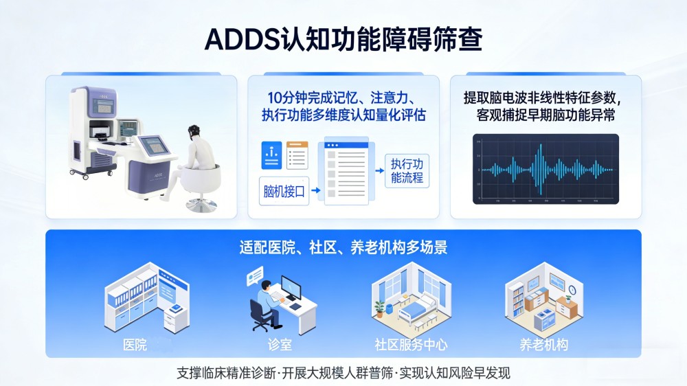 ADDS認(rèn)知功能障礙篩查高效便捷,全程無(wú)創(chuàng)、無(wú)需空腹,10幾分鐘即可完成記憶、注意力、執(zhí)行功能等多維度認(rèn)知量化評(píng)估;通過(guò)提取腦電波非線性特征參數(shù),客觀捕捉早期腦功能異常;適配醫(yī)院、社區(qū)、養(yǎng)老機(jī)構(gòu)等多場(chǎng)景,既可支撐臨床精準(zhǔn)診斷,也可開(kāi)展大規(guī)模人群普篩,真正把認(rèn)知風(fēng)險(xiǎn)“早發(fā)現(xiàn)”落到實(shí)處。