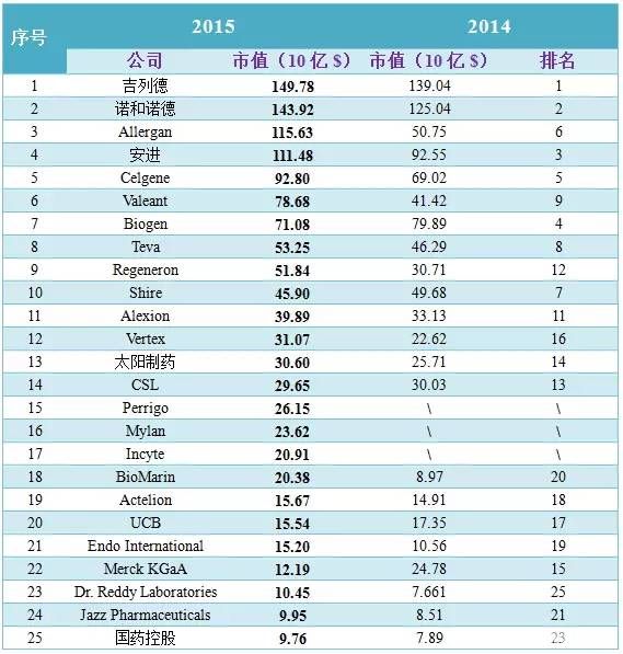 附:《2015年生物技術(shù)公司市值Top25榜單》
